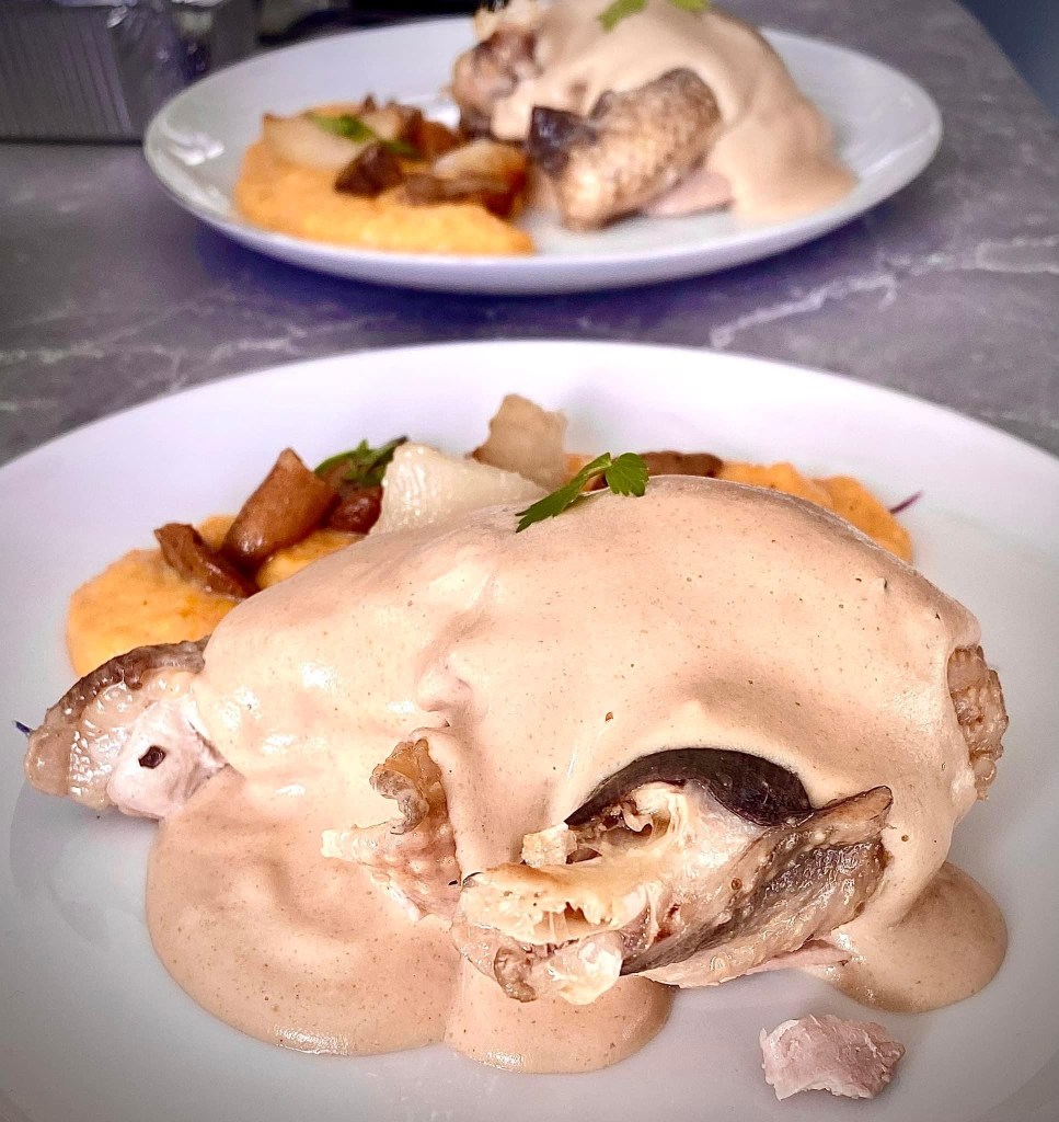 – suprême de pintade crème de morilles , légumes racines et cocos de paimpol au jus : 15,50 €